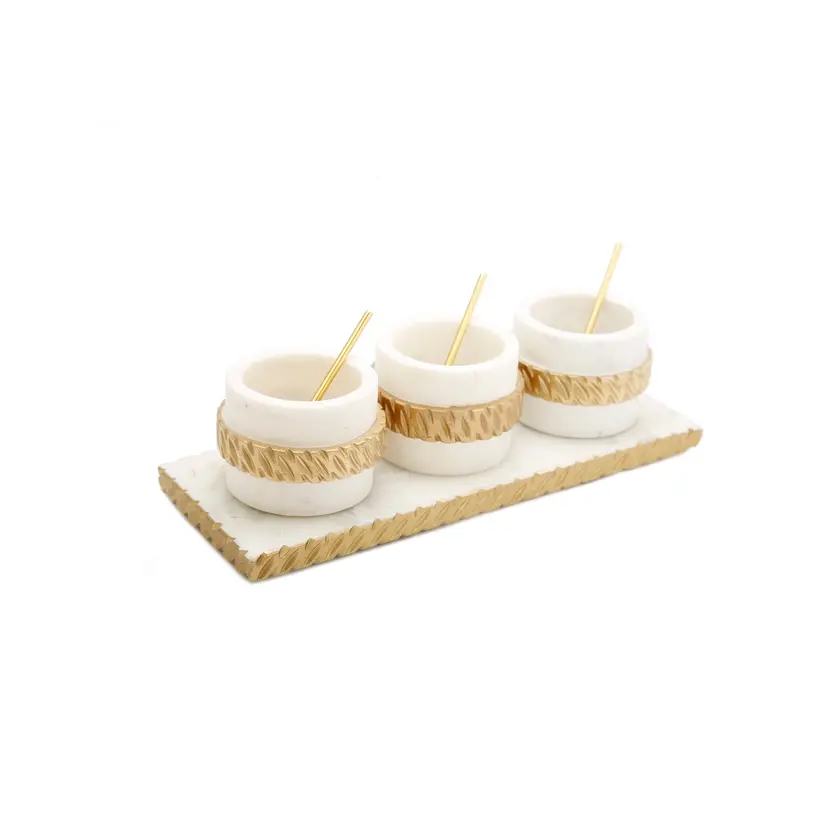 White Marble Condiment Tray w/ 3 Bowls & Golden Spoons